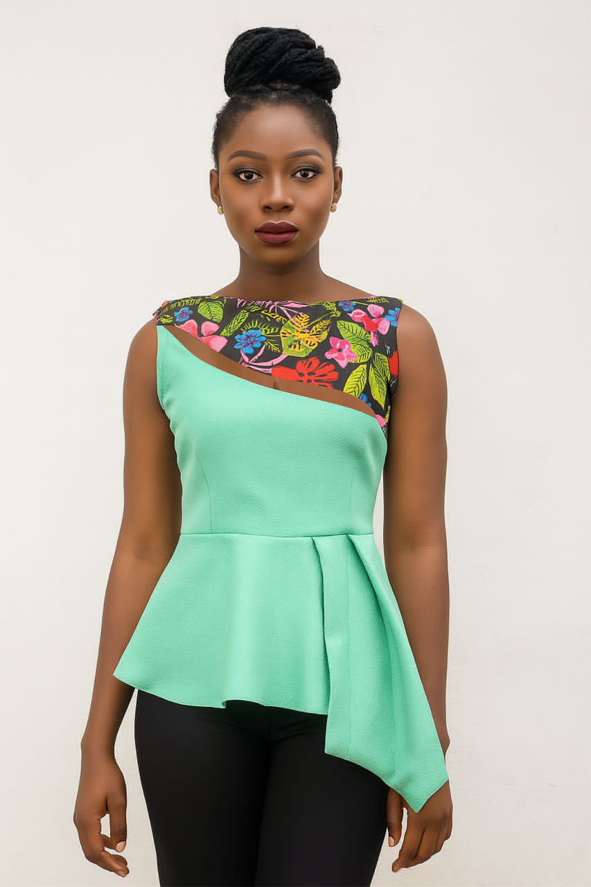 Be the first to review “GREEN PEPLUM WITH CUT-OUT FLORAL YOKE”
