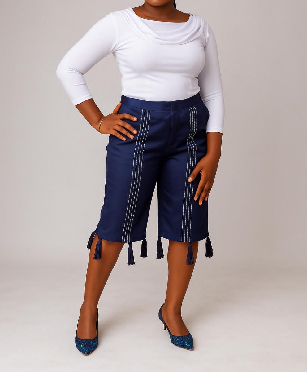 Be the first to review “BLUE MIKADO THREE-QUARTER TROUSERS WITH EMBROIDERY & TASSELS”